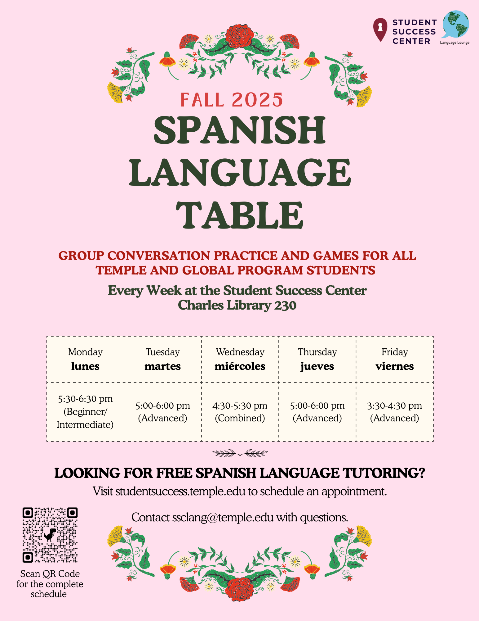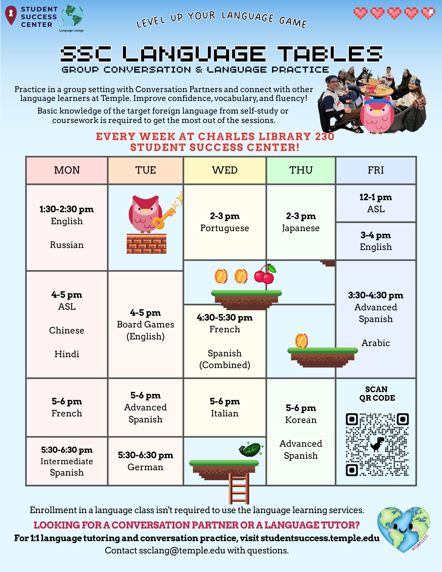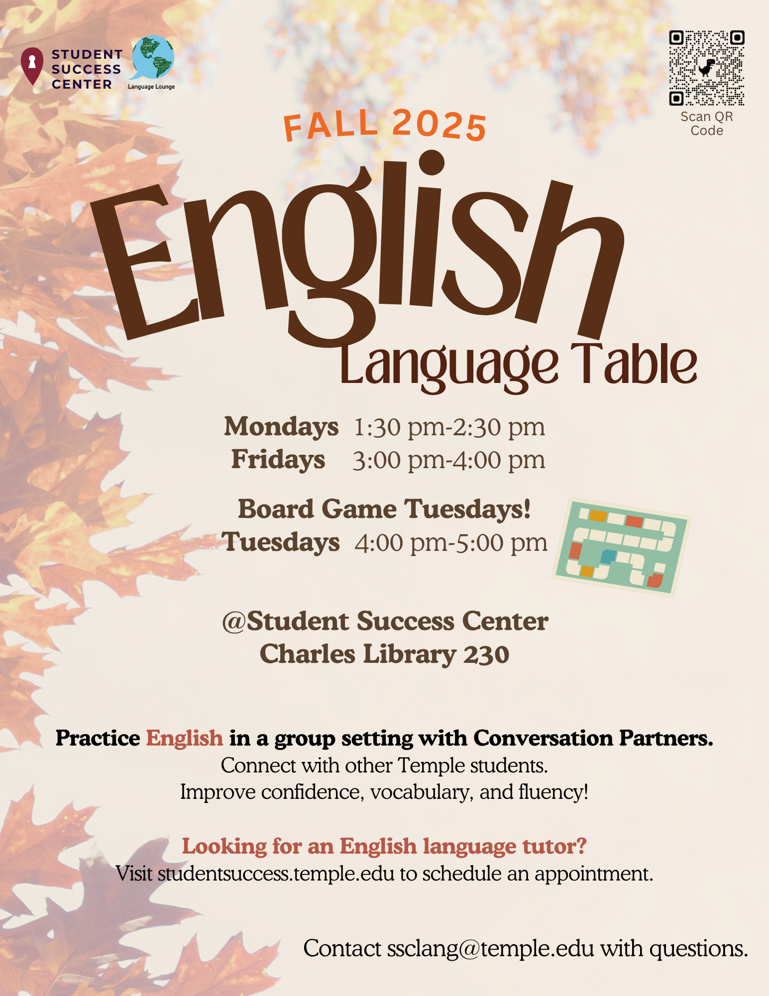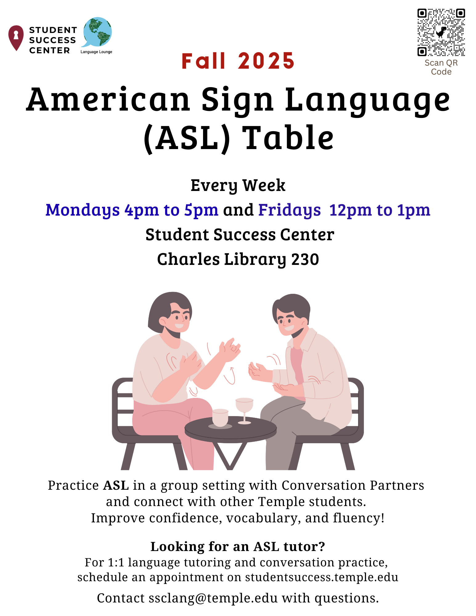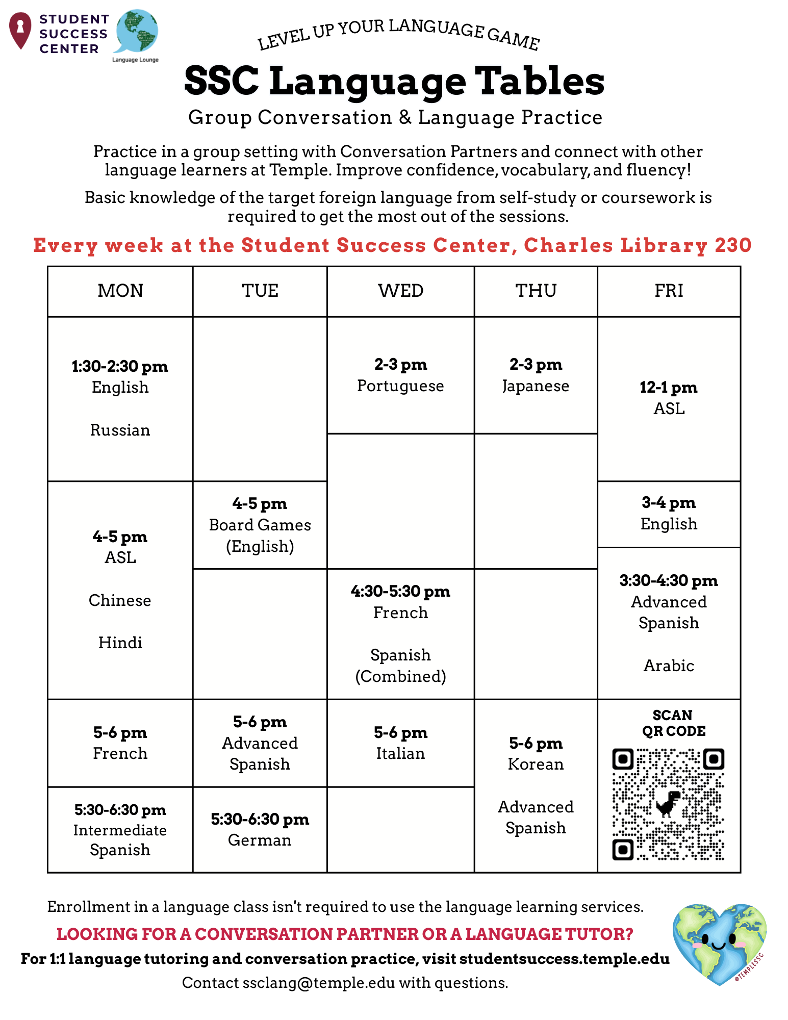 In Fall 2025, we will have weekly tables in Charles 230 for English as a Foreign Language (EFL), American Sign Language, Arabic, Chinese, French, German, Hindi, Italian, Japanese, Korean, Portuguese, Russian, and Spanish. See the schedule below!