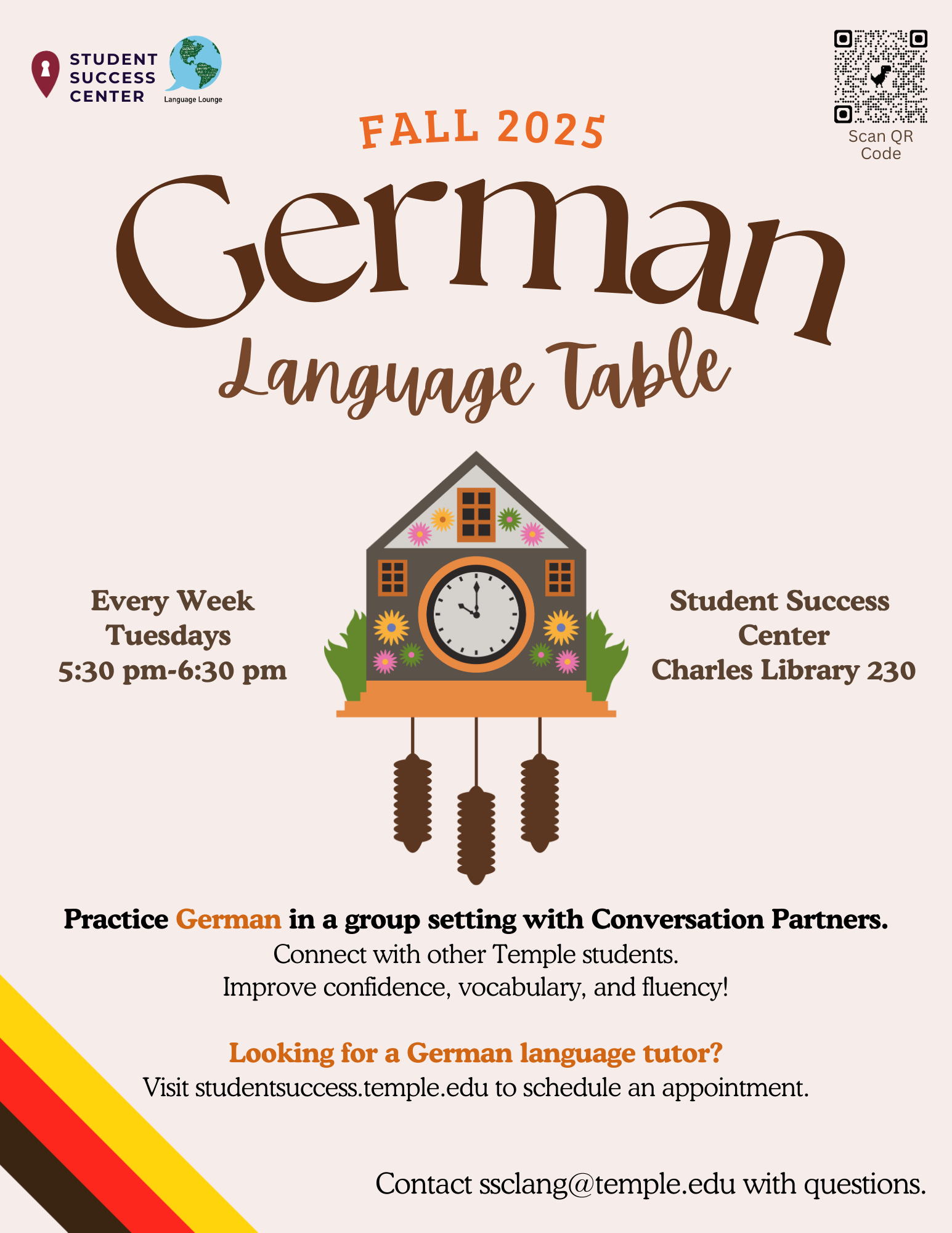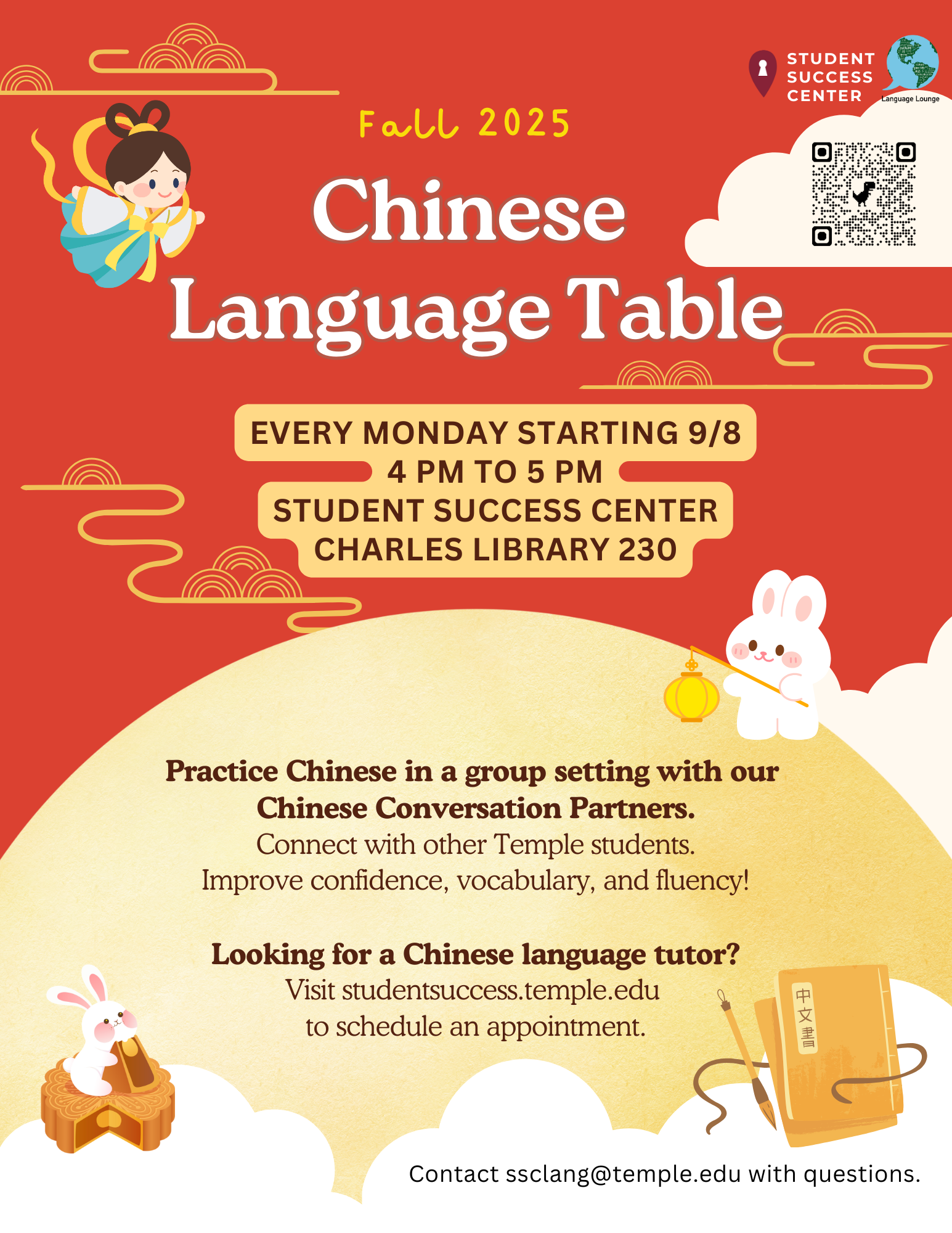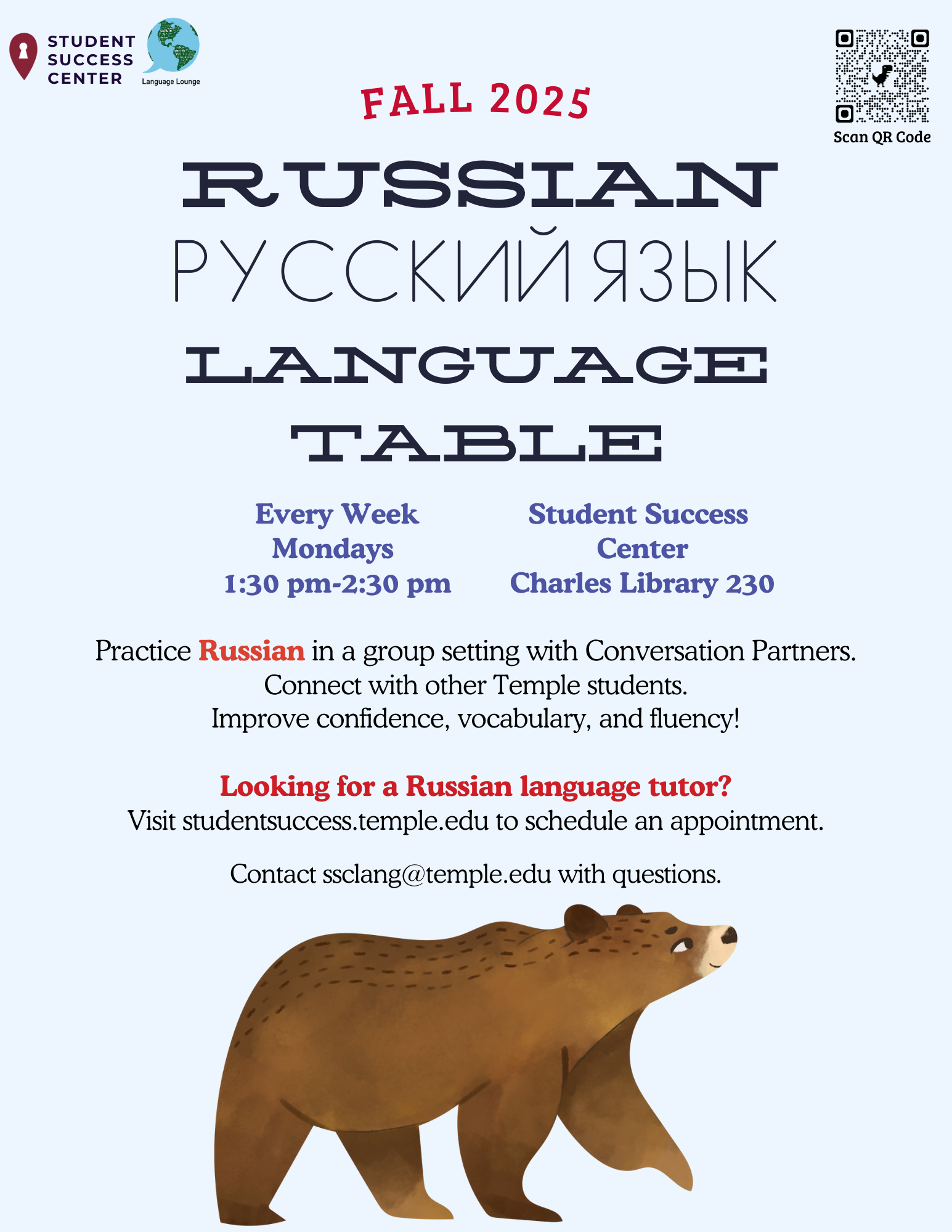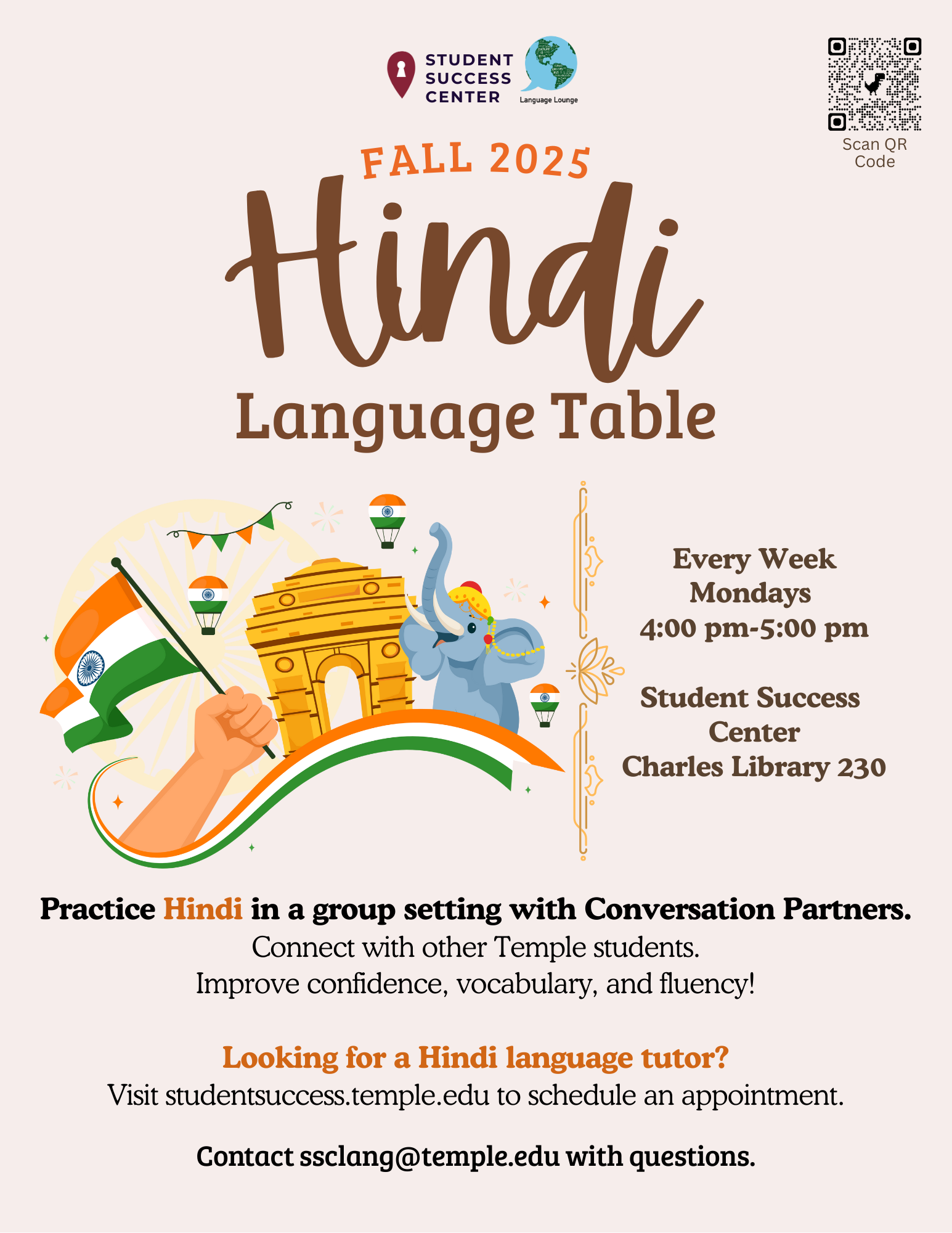 In Fall 2025, we will have weekly tables in Charles 230 for English as a Foreign Language (EFL), American Sign Language, Arabic, Chinese, French, German, Hindi, Italian, Japanese, Korean, Portuguese, Russian, and Spanish. See the schedule below!