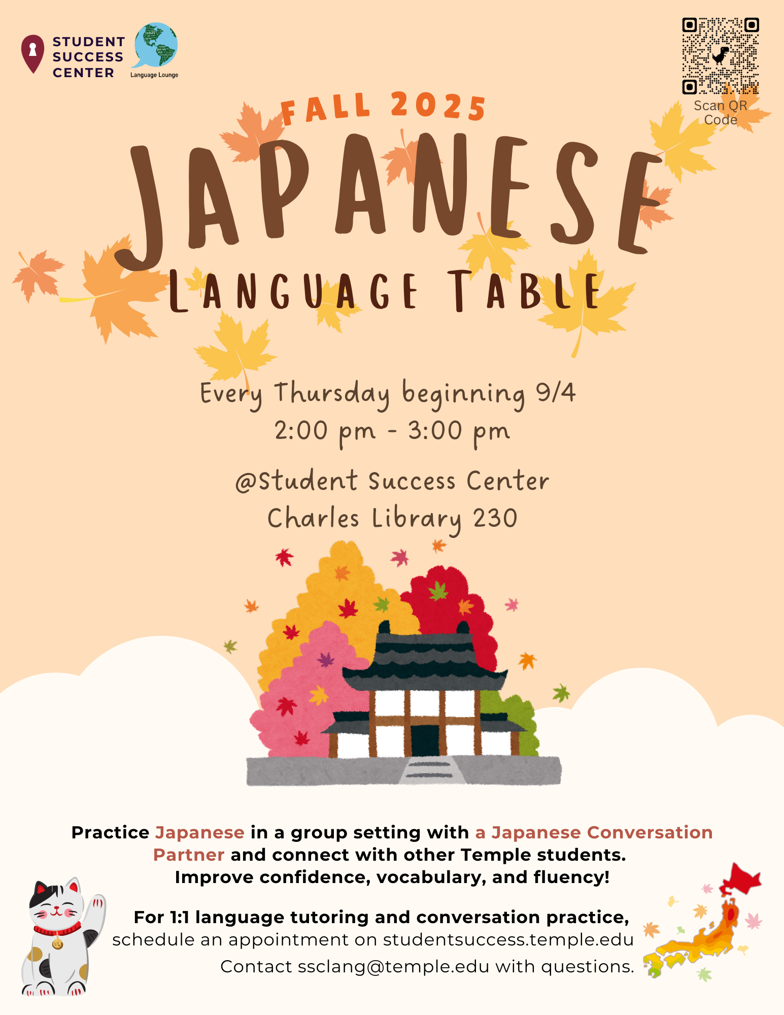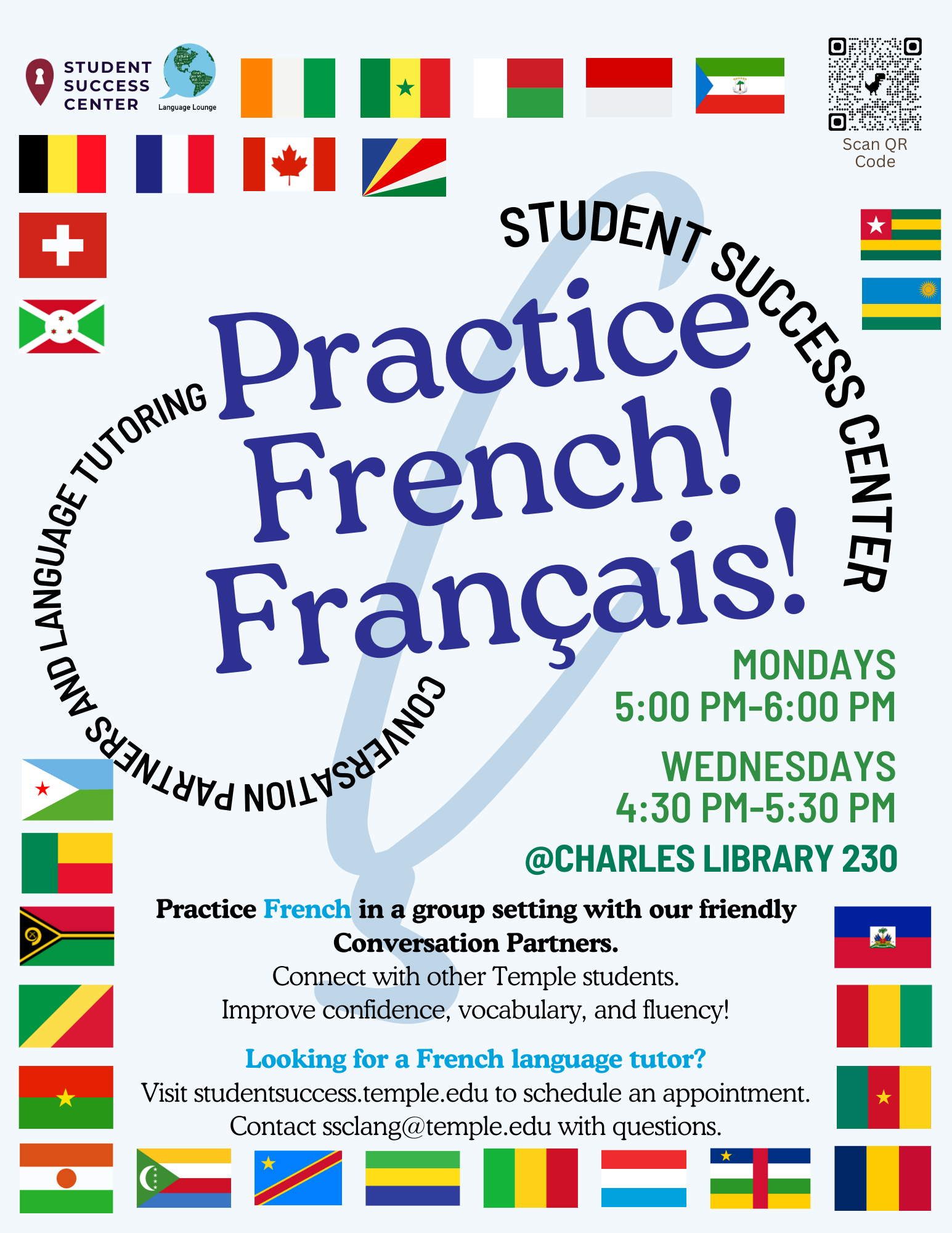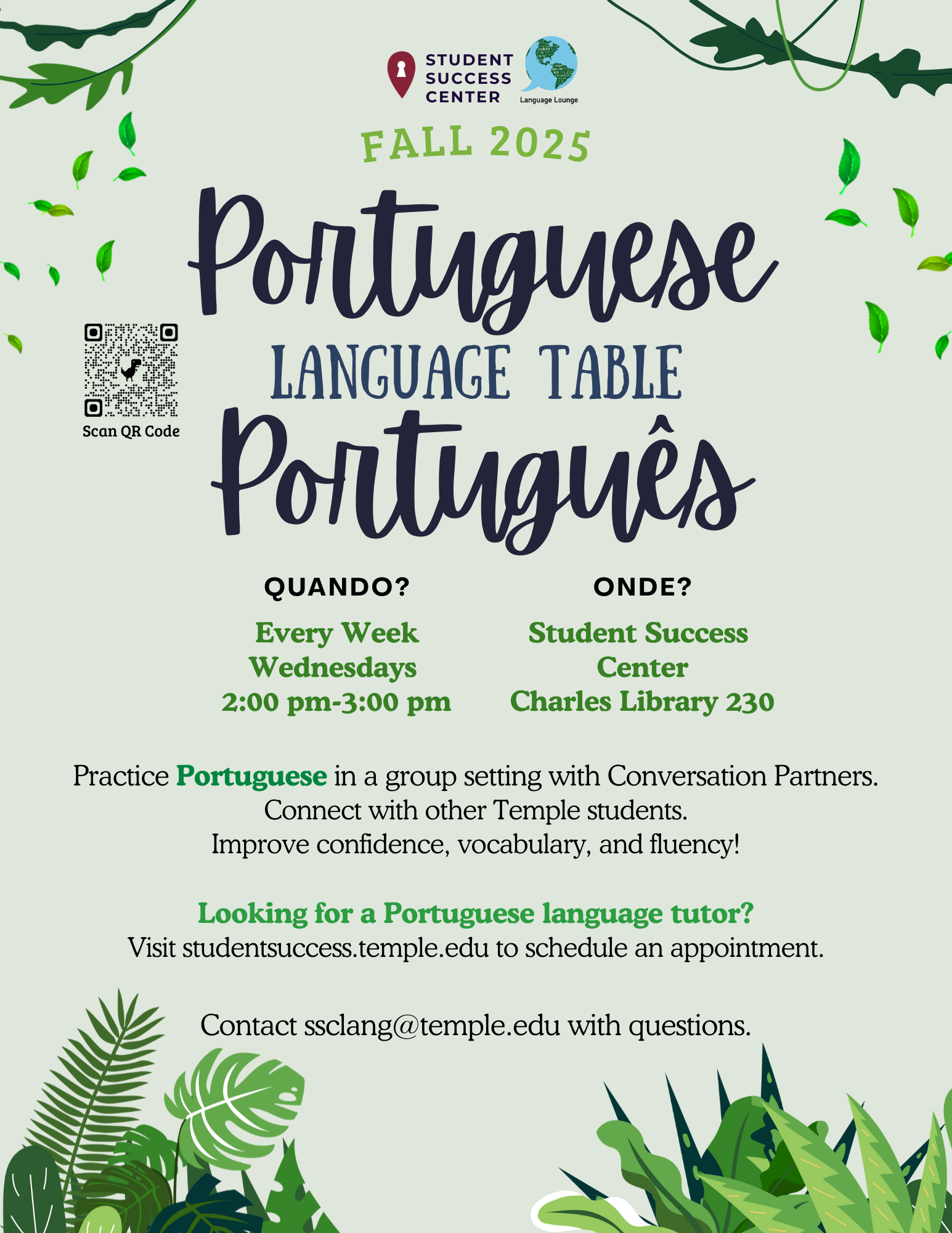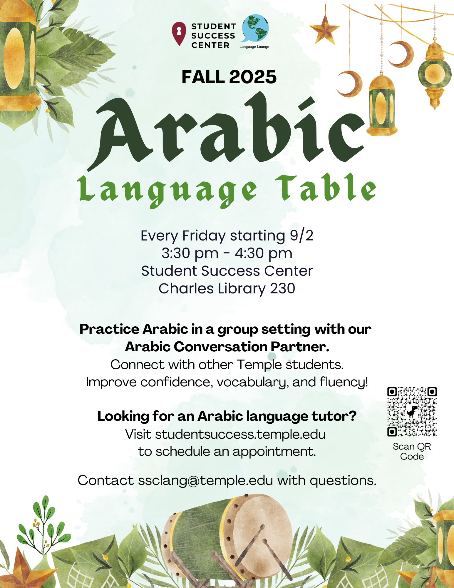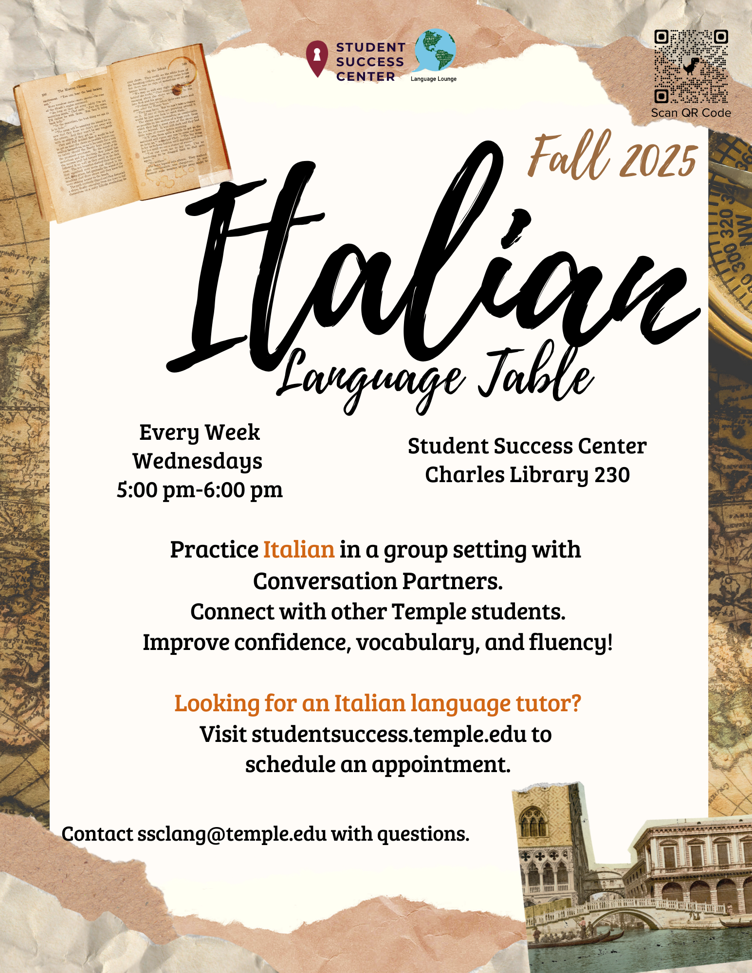 In Fall 2025, we will have weekly tables in Charles 230 for English as a Foreign Language (EFL), American Sign Language, Arabic, Chinese, French, German, Hindi, Italian, Japanese, Korean, Portuguese, Russian, and Spanish. See the schedule below!